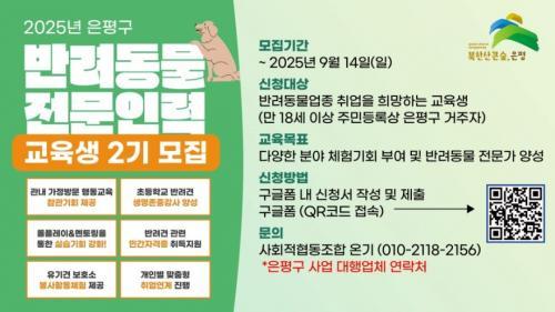 [½Åµ¿¾Æ¹æ¼Û ÀºÆò±¸=À̽ŵ¿±âÀÚ] ¼­¿ï ÀºÆò±¸´Â ¹Ý·Áµ¿¹° Àü¹®°¡¸¦ ¾ç¼ºÇϰí Ã롤â¾÷À» ¿¬°è Áö¿øÇÏ´Â ¡®¹Ý·Áµ¿¹° Àü¹®Àη ¾ç¼º °úÁ¤¡® 2±â ±³À°»ýÀ» ¿À´Â 9¿ù 14ÀϱîÁö ¸ðÁýÇÑ´Ù°í ¹àÇû´Ù. À̹ø ±³À°Àº ±Þ¼ºÀåÇÏ´Â ¹Ý·Áµ¿¹° »ê¾÷¿¡ ´ëÀÀÇØ °æÀï·ÂÀ» °®Ãá Àü¹®°¡¸¦¡¦
