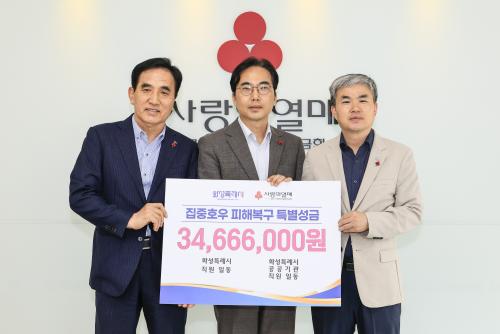 [½Åµ¿¾Æ¹æ¼Û=ÀÌÀçö±âÀÚ] È­¼ºÆ¯·Ê½Ã(½ÃÀå Á¤¸í±Ù)´Â 31ÀÏ »çȸº¹Áö°øµ¿¸ð±Ýȸ °æ±âÁöȸ¿¡ ÃÖ±Ù ÁýÁßÈ£¿ì·Î ÀÎÇØ Å« ÇÇÇØ¸¦ ÀÔÀº ÁֹεéÀ» À§ÇÑ Æ¯º°¼º±Ý 3,466¸¸ ¿øÀ» Àü´ÞÇß´Ù. À̳¯ Àü´Þ½Ä¿¡´Â Á¤±¸¿ø È­¼ºÆ¯·Ê½Ã Á¦1ºÎ½ÃÀå°ú ÇѺ´È« È­¼ºµµ½Ã°ø»ç »çÀå, ±èÈ¿Áø »ç¡¦