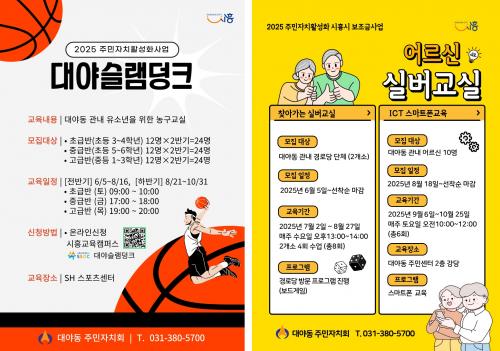 [½Åµ¿¾Æ¹æ¼Û ½ÃÈï½Ã=À̽ŵ¿±âÀÚ] ½ÃÈï½Ã ´ë¾ßµ¿ ÁÖ¹ÎÀÚġȸ°¡ ¡®2025³â ÁÖ¹ÎÀÚġȰ¼ºÈ­ »ç¾÷¡¯À¸·Î ÃßÁø ÁßÀÎ ÃÑ 8°³ »ç¾÷ °¡¿îµ¥ ¡®´ë¾ß½½·¥µ¢Å©3¡¯¿Í ¡®¾î¸£½Å ½Ç¹ö±³½Ç2–Á¤º¸Åë½Å±â¼ú(ICT) ½º¸¶Æ®Æù ±³À°¡¯ ÇÁ·Î±×·¥ÀÇ Âü¿©ÀÚ¸¦ ¸ðÁýÇϰí ÀÖ´Ù. Âü¿© ½ÅûÀº¡¦