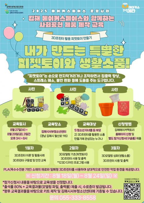 [½Åµ¿¾Æ¹æ¼Û °æ³²±èÇØ=³²±Ã¿µ±â±âÀÚ] ±èÇØÀÇ»ý¸í¡¤»ê¾÷ÁøÈï¿ø(ÀÌÇÏ ÁøÈï¿ø)Àº ¸ÞÀÌÄ¿½ºÆäÀ̽º ¿î¿µ»ç¾÷ÀÇ ÀÏȯÀ¸·Î, Áö¿ª»çȸ¿ÍÀÇ Çù·ÂÀ» ±â¹ÝÀ¸·Î ÇÑ »çȸ°øÇå ÇÁ·Î±×·¥À» »õ·Ó°Ô ¸¶·ÃÇÏ¿© ¿ÃÇØºÎÅÍ ¿î¿µÀ» ½ÃÀÛÇÑ´Ù°í 25ÀÏ ¹àÇû´Ù. ÇÁ·Î±×·¥Àº 3DÇÁ¸°ÅÍ È°¿ë ÇÇÁ¬Å䡦