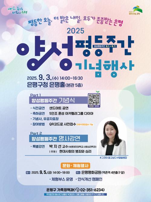 [½Åµ¿¾Æ¹æ¼Û ÀºÆò±¸=À̽ŵ¿±âÀÚ] ¼­¿ï ÀºÆò±¸´Â ÆòµîÇÑ Áö¿ª»çȸ¸¦ ¸¸µé¾î°¡±â À§ÇÑ ¡®¾ç¼ºÆòµîÁÖ°£ ±â³äÇà»ç¡¯¸¦ ³»´Þ 3Àϰú 5ÀÏ¿¡ °³ÃÖÇÑ´Ù°í ¹àÇû´Ù. ¾ç¼ºÆòµîÁÖ°£ÀÎ ³»´Þ 1ºÎÅÍ 7ÀϱîÁö´Â ¡¸¾ç¼ºÆòµî±âº»¹ý¡¹¿¡ µû¶ó Á¤Ä¡¡¤°æÁ¦¡¤»çȸ¡¤¹®È­ Àü¹Ý¿¡¼­ ¼ºÂ÷º°À» ÇØ¡¦