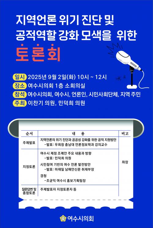 ¿©¼ö½ÃÀÇȸ, ¿À´Â 9¿ù 2ÀÏ ¡®Áö¿ª¾ð·Ð À§±âÁø´Ü°ú °øÀû¿ªÇÒ °­È­ Åä·Ðȸ¡¯ °³ÃÖ