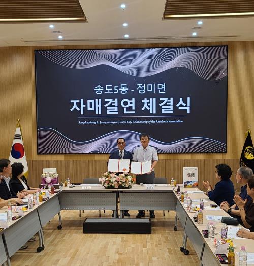 [½Åµ¿¾Æ¹æ¼Û=ÀÌÀçö±âÀÚ] ´çÁø½Ã Á¤¹Ì¸é(¸éÀå ¹Ú¸í¼ö)Àº Áö³­ 3ÀÏ Á¤¹Ì¸é ÁÖ¹ÎÀÚġȸ¿Í ÀÎõ½Ã ¿¬¼ö±¸ ¼Ûµµ5µ¿ ÁÖ¹ÎÀÚġȸ°¡ »óÈ£ ±³·ù¿Í Çù·ÂÀ» ÅëÇÑ °øµ¿ ¹ßÀüÀ» µµ¸ðÇϱâ À§ÇØ ÀڸŰῬ Çù¾àÀ» ¸Î¾ú´Ù°í 4ÀÏ ¹àÇû´Ù. 3ÀÏ ¿ÀÈÄ ¼Ûµµ5µ¿ ÇàÁ¤º¹Áö¼¾ÅÍ È¸Àǽǿ¡¼­ ¿­¡¦