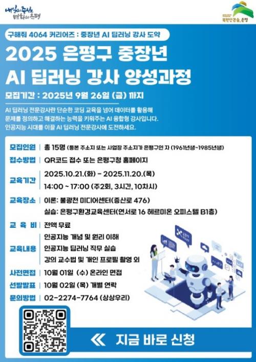 [½Åµ¿¾Æ¹æ¼Û ÀºÆò±¸=À̽ŵ¿±âÀÚ] ¼­¿ï ÀºÆò±¸´Â ÁßÀå³âÃþÀÇ °æ·ÂÀüȯ°ú âÁ÷(óÜòÅ)À» Áö¿øÇϱâ À§ÇØ ¡®±¸ÇØÁà 4064 Ä¿¸®¾îÁî ½ÃÁð2: AI ÀΰøÁö´É(µö·¯´×) ±³À° Àü¹®°¡ ¾ç¼º°úÁ¤¡¯ Âü¿©ÀÚ¸¦ ¸ðÁýÇÑ´Ù°í ¹àÇû´Ù. ¡®±¸ÇØÁà 4064 Ä¿¸®¾îÁ´Â 40¼¼~64¼¼ ÁßÀå³âÃþÀ» ´ë»ó¡¦