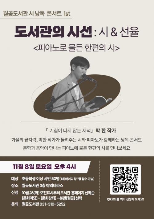 [½Åµ¿¾Æ¹æ¼Û ½ÃÈï½Ã=À̽ŵ¿±âÀÚ] ½ÃÈï½Ã ¿ù°ùµµ¼­°üÀº ¿À´Â 11¿ù 8ÀÏ ¿ÀÈÄ 4½Ã, ¿ù°ùµµ¼­°ü ¾ß¿Ü Å׶󽺿¡¼­ ¾î¸°À̸¦ ºñ·ÔÇÑ ¸ðµç ¼¼´ë°¡ ÇÔ²² °¨»óÇÒ ¼ö ÀÖ´Â ¡®µµ¼­°üÀÇ ½Ã¼±:½Ã&¼±À²¡¯ Çà»ç¸¦ ÁøÇàÇÑ´Ù. ±í¾î °¡´Â °¡À»³¯, ½Ã¿Í ÇÇ¾Æ³ë ¿¬ÁÖ°¡ ¾î¿ì·¯Áö´Â ³¶¸¸Àû¡¦