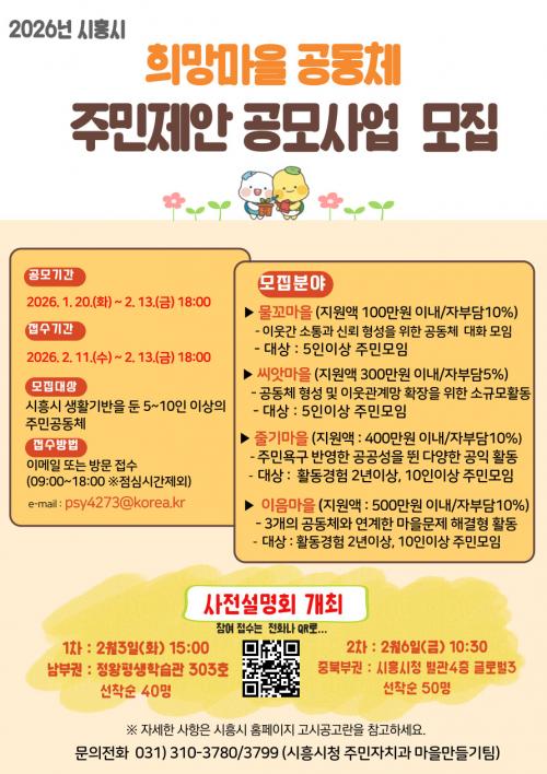 [½Åµ¿¾Æ¹æ¼Û ½ÃÈï½Ã=À̽ŵ¿±âÀÚ] ½ÃÈï½Ã´Â ÁÖ¹ÎÀÌ ÁÖµµÇÏ´Â ¸¶À»°øµ¿Ã¼ Ȱ¼ºÈ­¸¦ À§ÇØ ¡®2026³â ½ÃÈï½Ã Èñ¸Á¸¶À»°øµ¿Ã¼ ÁÖ¹ÎÁ¦¾È °ø¸ð»ç¾÷¡¯À» ÃßÁøÇϰí, ½Ã¹ÎµéÀÇ ÀÌÇØ¸¦ µ½±â À§ÇÑ ±Ç¿ªº° »çÀü¼³¸íȸ¸¦ ´ÙÀ½ ´Þ ³²ºÎ±Ç°ú ÁߤýºÏºÎ±ÇÀ¸·Î ³ª´²¼­ °³ÃÖÇÑ´Ù. °ü·Ã »ç¾÷¡¦